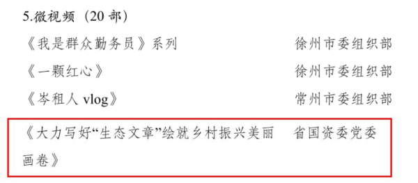 微视频《大力写好“生态文章”绘就乡村振兴美丽画卷》把镜头对准省环保集团三位有驻村经历的党员干部,讲述了集团认真落实中央和省委、省政府关于乡村振兴的各项部署,把国企所能、专业所长与发展所需紧密结合起来,探索出一条产业旺村、文明兴村、科技富村的帮扶之路。作品以平凡的镜头语言展现了江苏国企积极履行社会责任的担当作为,用实践中鲜活生动的案例向全省党员传递了新时代环保铁军勇挑重担、善作善成、无私奉献的精神力量。