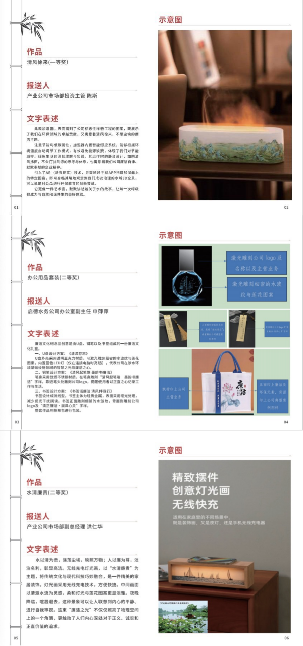 本次活动以“清风廉韵 匠心传承”为主题,通过全员参与、寓教于创的形式,深度挖掘廉洁文化创意内涵,可谓是一场精彩绝伦的思想碰撞。投稿作品涵盖了办公用品、文创摆件、数字产品、生活家居等多个领域,融汇了莲花、翠竹、清泉、水晶、茶叶等多种廉洁文化符号,彰显了廉洁主题和公司主责主业,廉洁创意与实物载体相结合,具有较好的使用价值和警示教育意义。其中一等奖作品《清风徐来》创意,以加湿器为载体,通过巧妙的构思融入廉洁元素和公司主业,既传达了节能低碳的环保理念,又运用AR技术和内置感应系统,展示产业公司在涉水环保领域所做出的卓越贡献,向使用者生动讲述了关于水和廉洁的故事,也让每一次呼吸都成为人与自然和谐共生的美好体验。