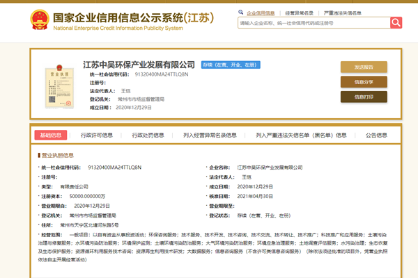 发布日期:2022-04-26 12:51 来源:江苏中吴环保产业发展有限公司 字体:[ 大 中 小 ]一、工商注册登记等企业基本信息
