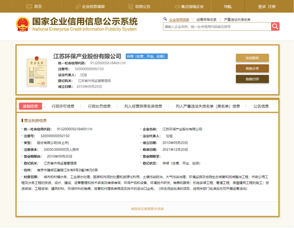 发布日期:2022-04-26 13:03 来源:江苏环保产业股份有限公司 字体:[ 大 中 小 ] 一、工商注册登记等企业基本信息